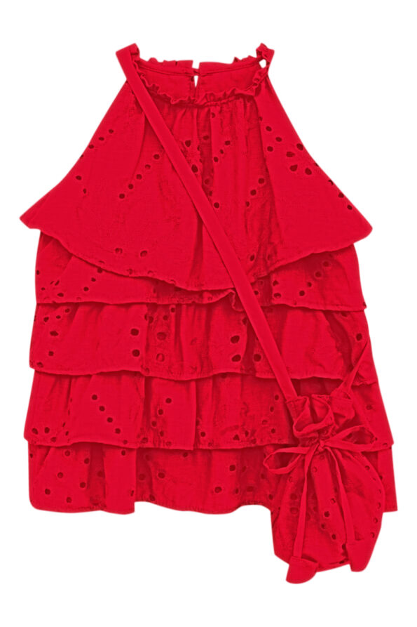 O vestido Belle é confeccionado no tecido de viscose com duas camadas em babado franzido, alça franzida com elástico e detalhe nas costas com botão em madeira. Acompanha uma linda bolsinha com alça metalizada.