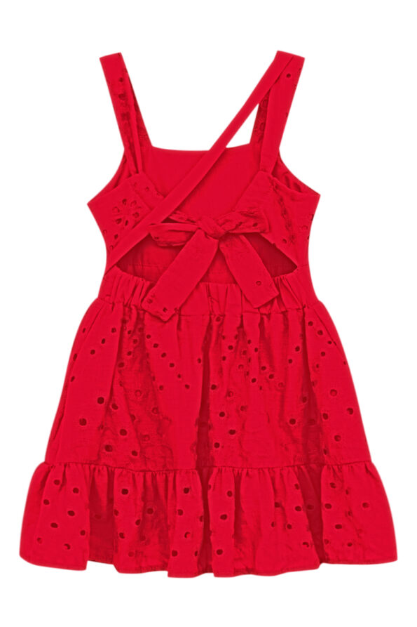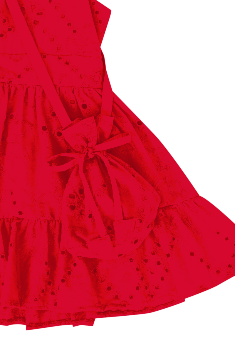 O Vestido Gabrielle é confeccionado no tecido de algodão na cor vermelho todo bordado de flor com leve brilho. Possui camadas levemente franzidas, gola redonda com babadinhos no decote e botões perolados frontais. Comprimento MIDI. Delicado e versátil para os dias de passeio.